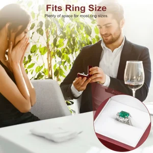 L’extérieur utilise un bois MDF haute densité, soigneusement poli pour offrir une finition semi-brillante. À l’intérieur, le velours doux et la mousse protectrice maintiennent la bague sans la rayer. Chaque élément garantit une utilisation durable. De plus, la charnière solide et la fermeture ajustée assurent une protection optimale contre la poussière et les chocs.