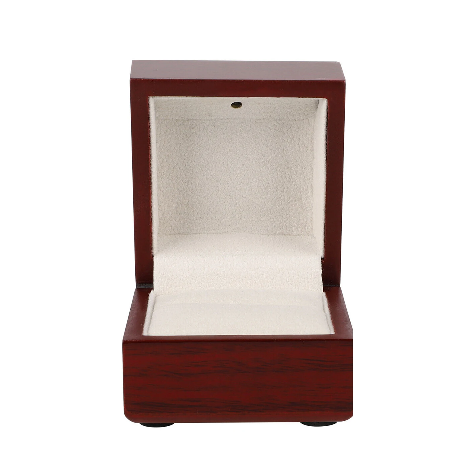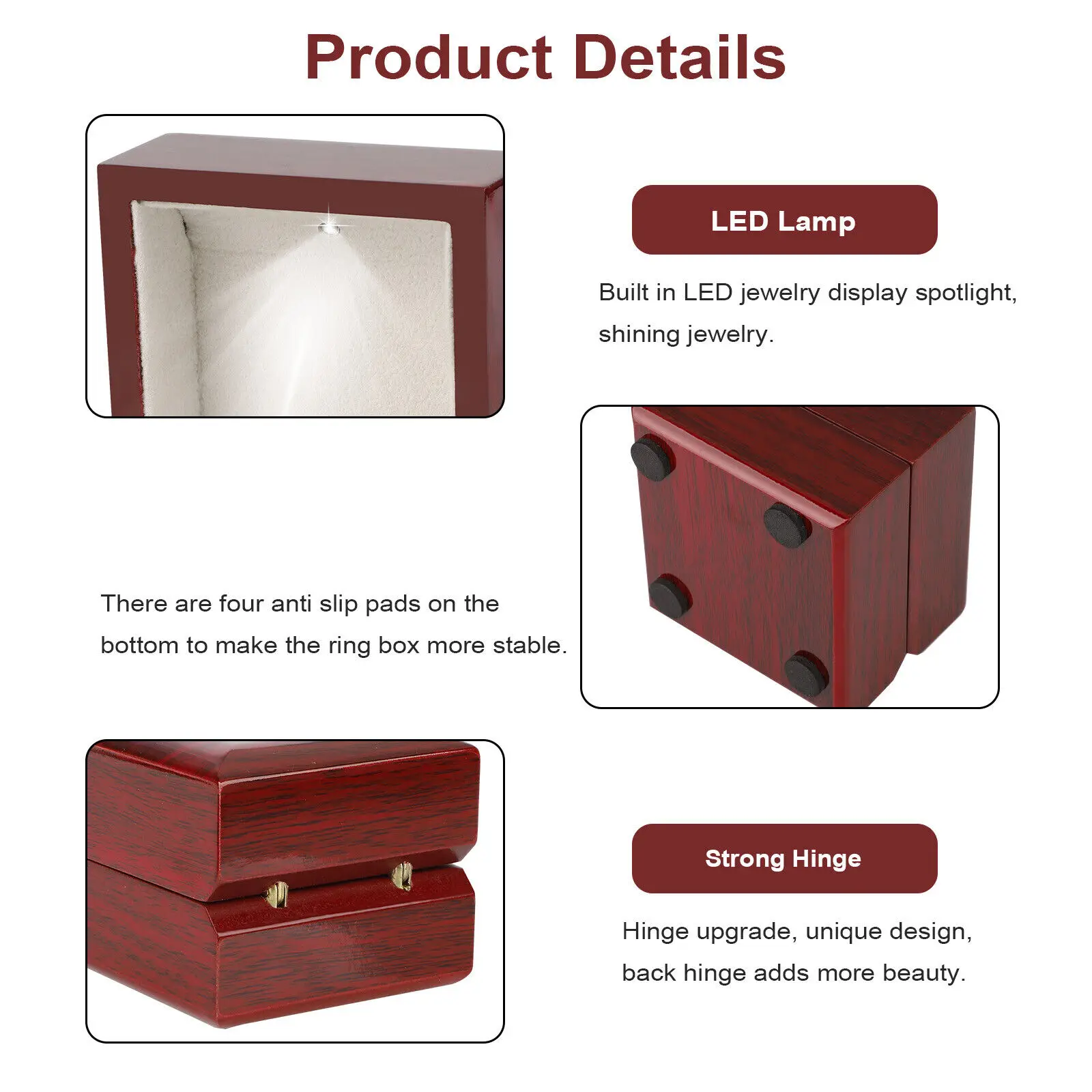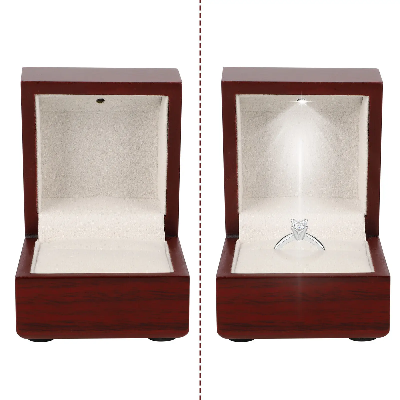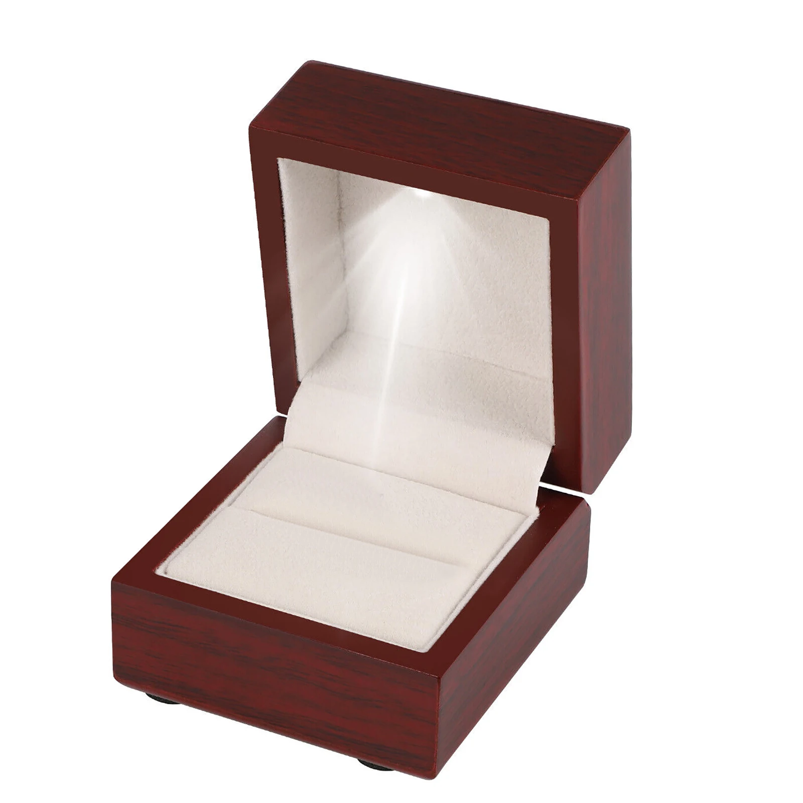 Élégant écrin à bague en bois avec intérieur velours rouge et lumière LED intégrée. Un design raffiné pour protéger et sublimer vos bijoux.