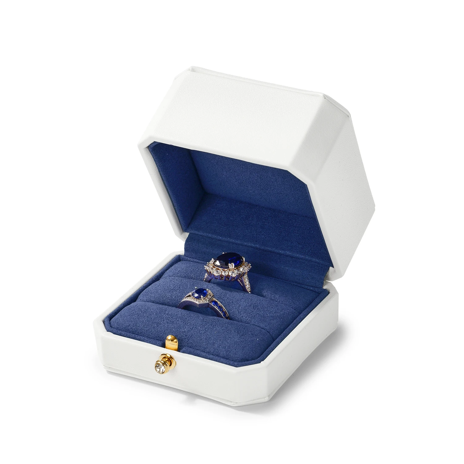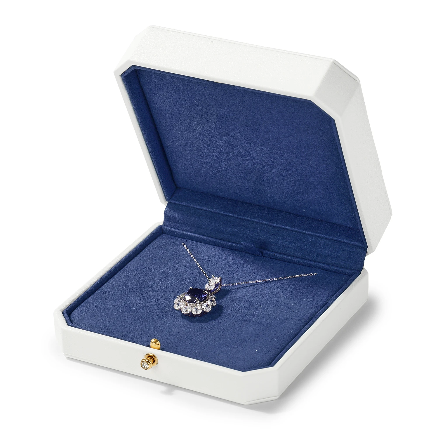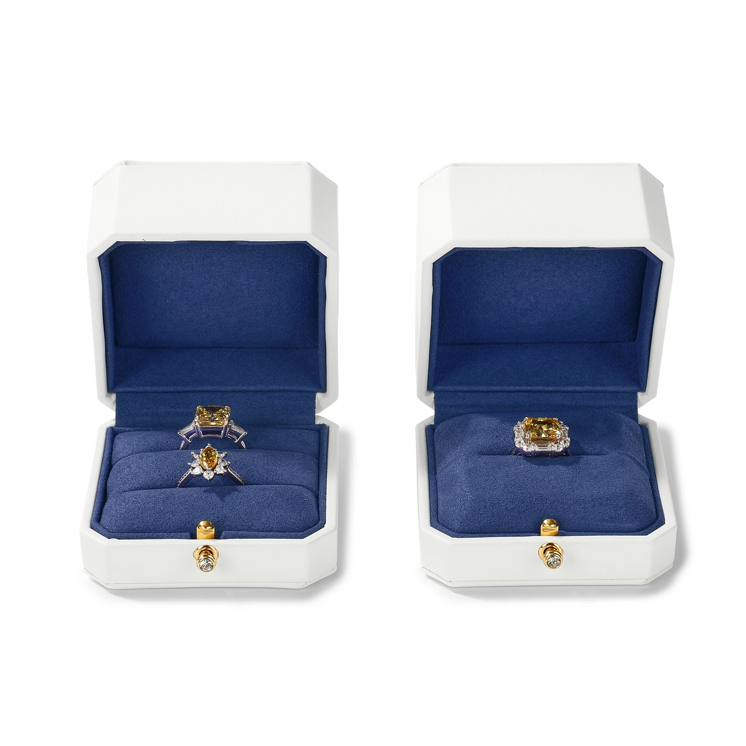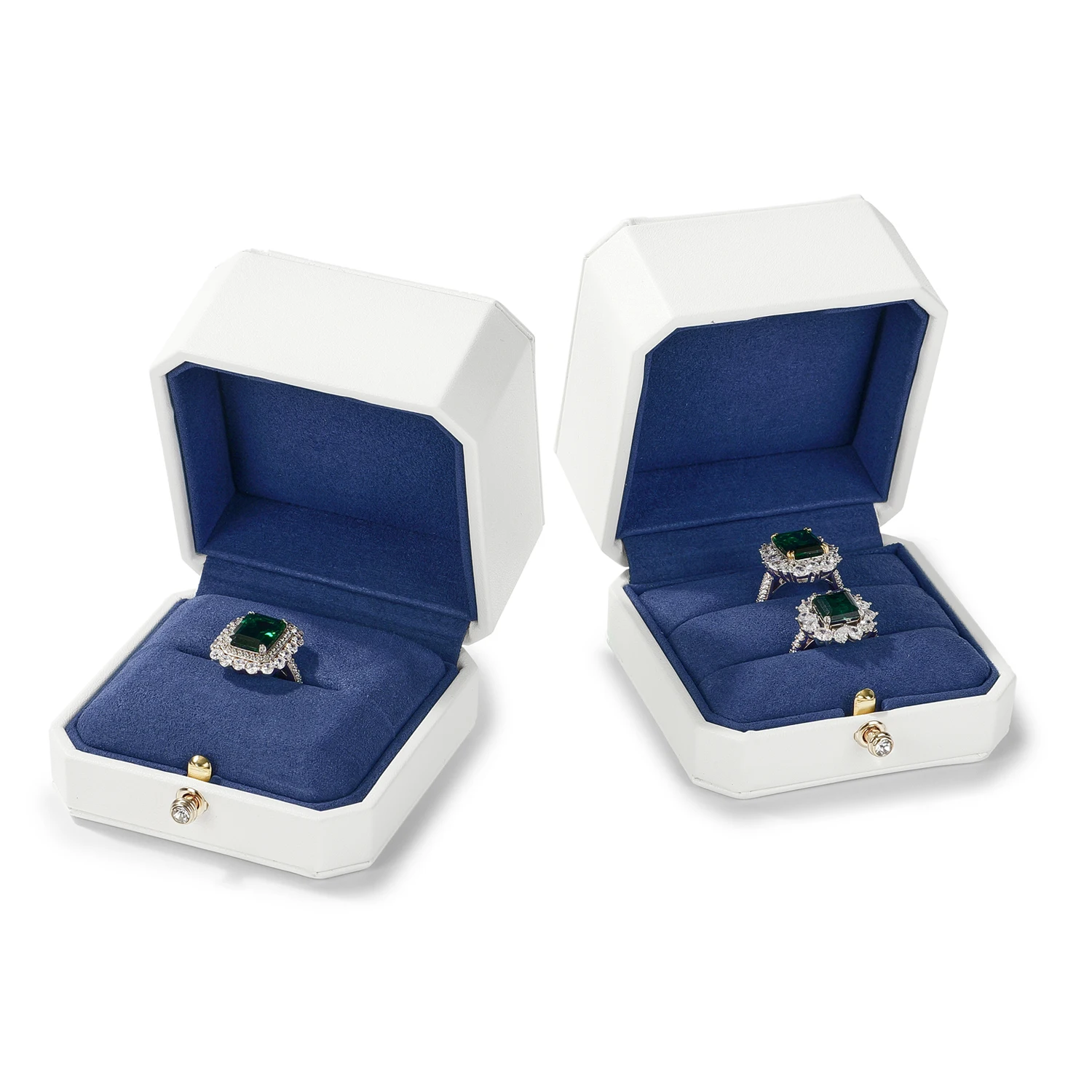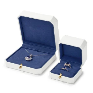 Le mariage du blanc éclatant et du bleu profond évoque la perfection visuelle d’un bijou bien mis en scène. Chaque écrin sublime la lumière et met en valeur le métal et les pierres, créant une présentation raffinée digne des plus belles vitrines.